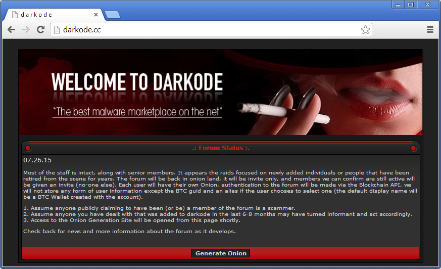 Currently we’re greeted with a message addressing the raids and containing some information about the new site; however, the page currently leads nowhere and the “Generate Onion” button doesn’t work (though the information given is quite interesting).